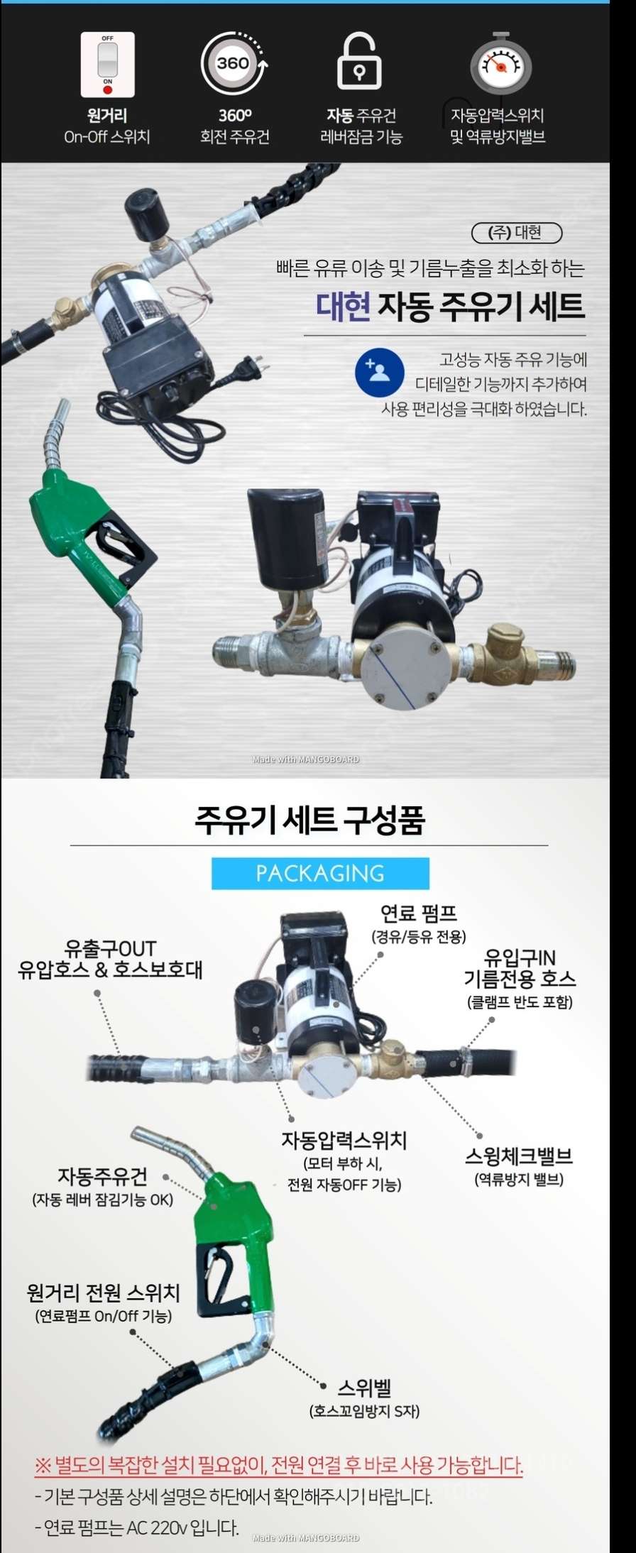 안녕하세요? 대현 유수분리기입니다. 많은 분들께서 자동주유기세트를 만들어달라고 요청하셔서, 자동주유기 세트 국산모터 및 사용성을 강화하여 출시했습니다. 많은 관심 부탁드리겠습니다!