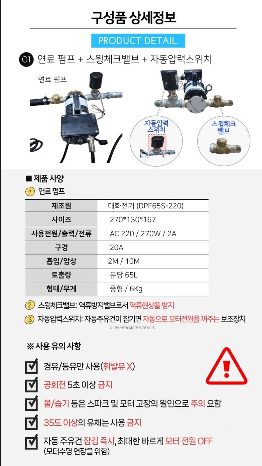 - 자동모터 및 주유건 사용시 기름통 내부 이물질 및 수분이 빨려나갑니다. 자동모터 및 주유건을 사용하시는 분들은 어쩔수없는 경우 제외 유수분리기를 필히 장착하여 사용하시는 것을 권장드립니다.