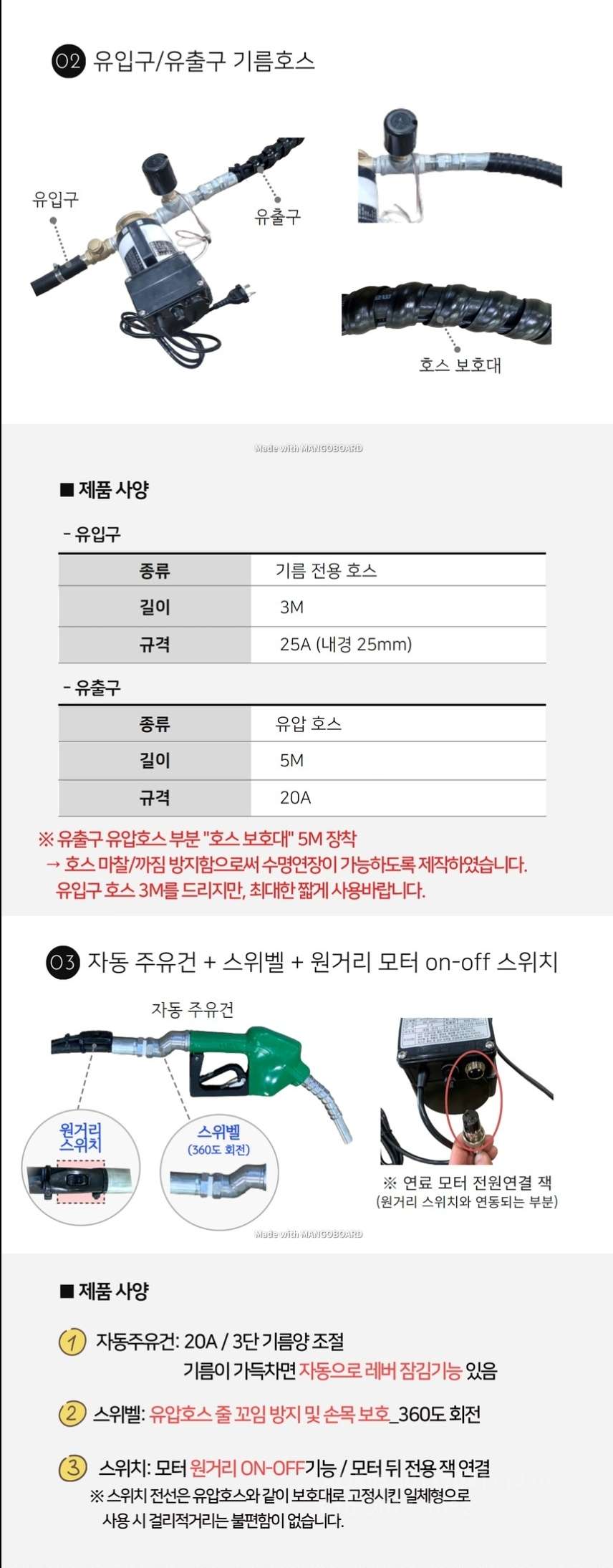 4) 유입구 /유출구 호스 일체 : 유입구 3M / 유출구 유압호스 5M 지원