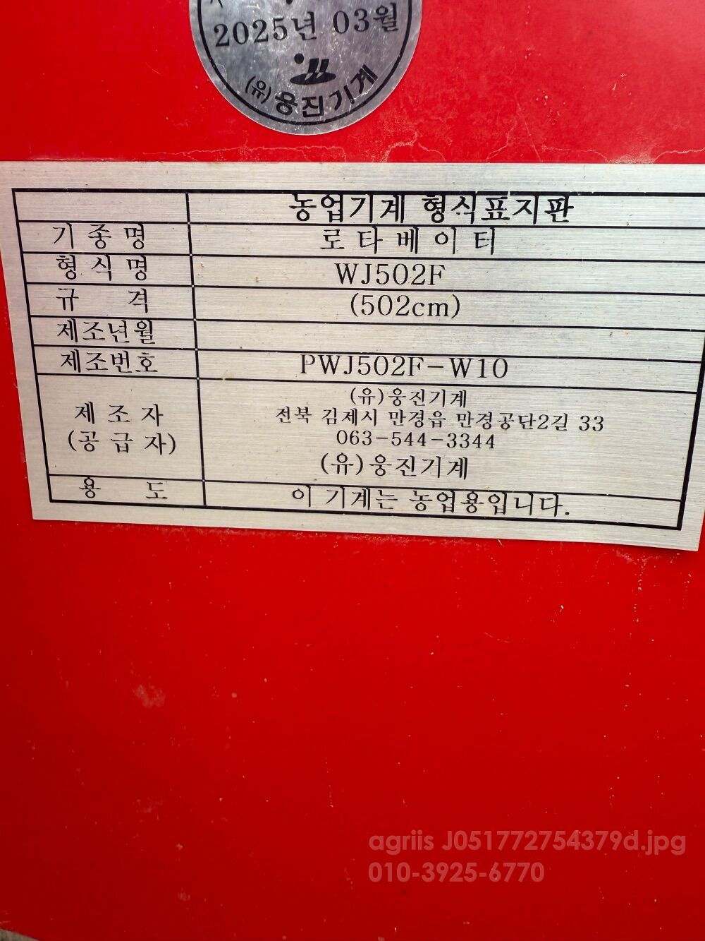 웅진기계 로타리 WJ502F (경폭502cm) 2025년식 100시간
