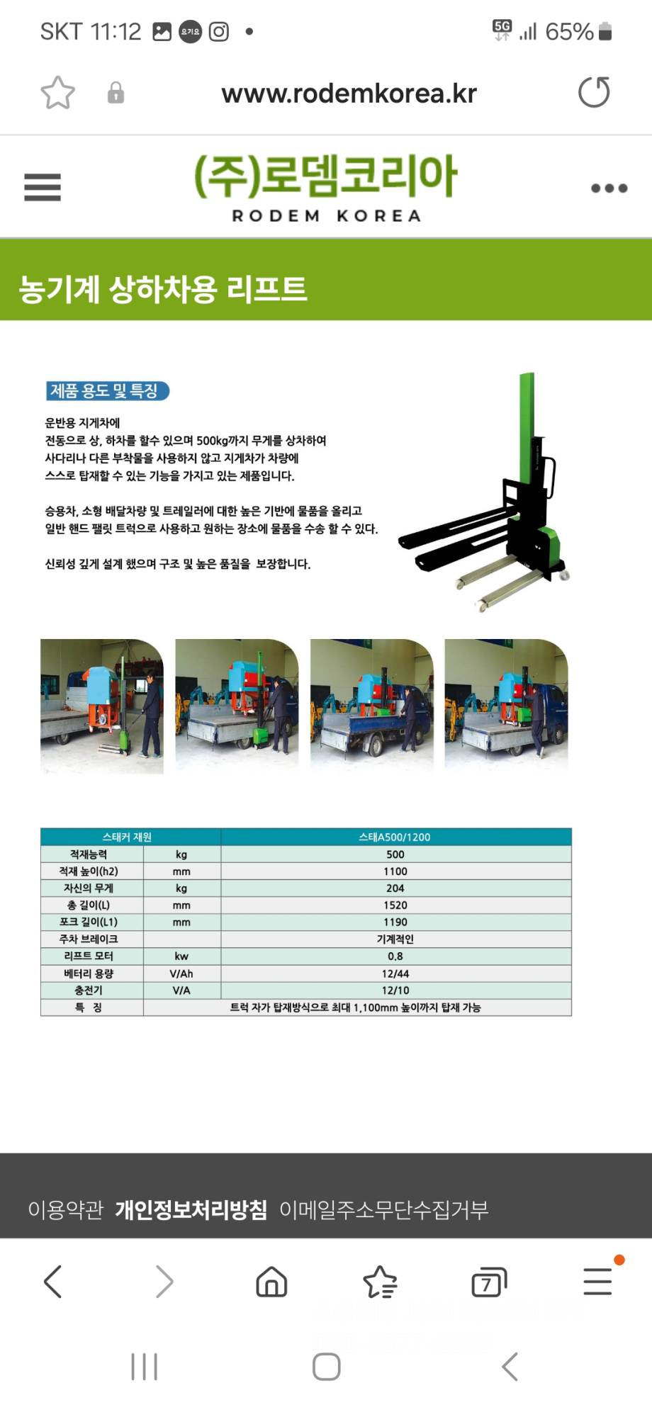 로뎀코리아 전동스테커 전동리프트 농기계상하차 지게차 리프트 상하차리프트 RDK-A500-1200
